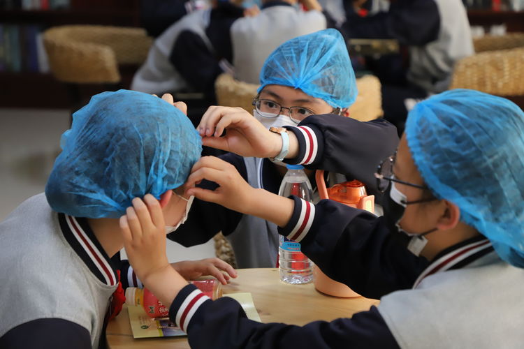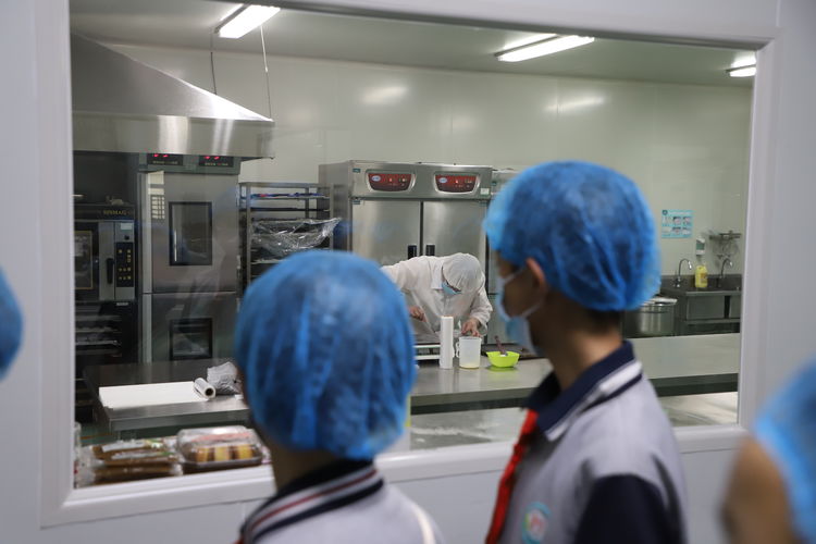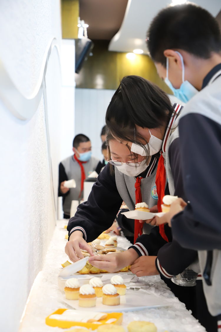 下午五点半,我们返回学校。此时,正值我校的“骞翮”课程正在进行,王炎夏校长和贾淑梅老师趁热打铁带领学生又钻进了烘焙坊。烘焙坊课程属于我校“骞翮”课程体系中的“惠创”设计,课程内容以学生兴趣为导向,精心制定烘焙学习及实践计划,专业烘焙指导师和学校教师亲自带教,实践帮助学生收获更多的知识和技能。课程内容包括制作饼干、面包、蛋糕等丰富美食,每个学生带着兴趣和热爱而来,又带着亲自动手做的美食而归,分享通过劳动收获的喜悦和幸福。提倡学生在课程实践的过程中,通过行走的研学课堂,打造出学和习兼有的路径,让学生得到更综合的发展。
